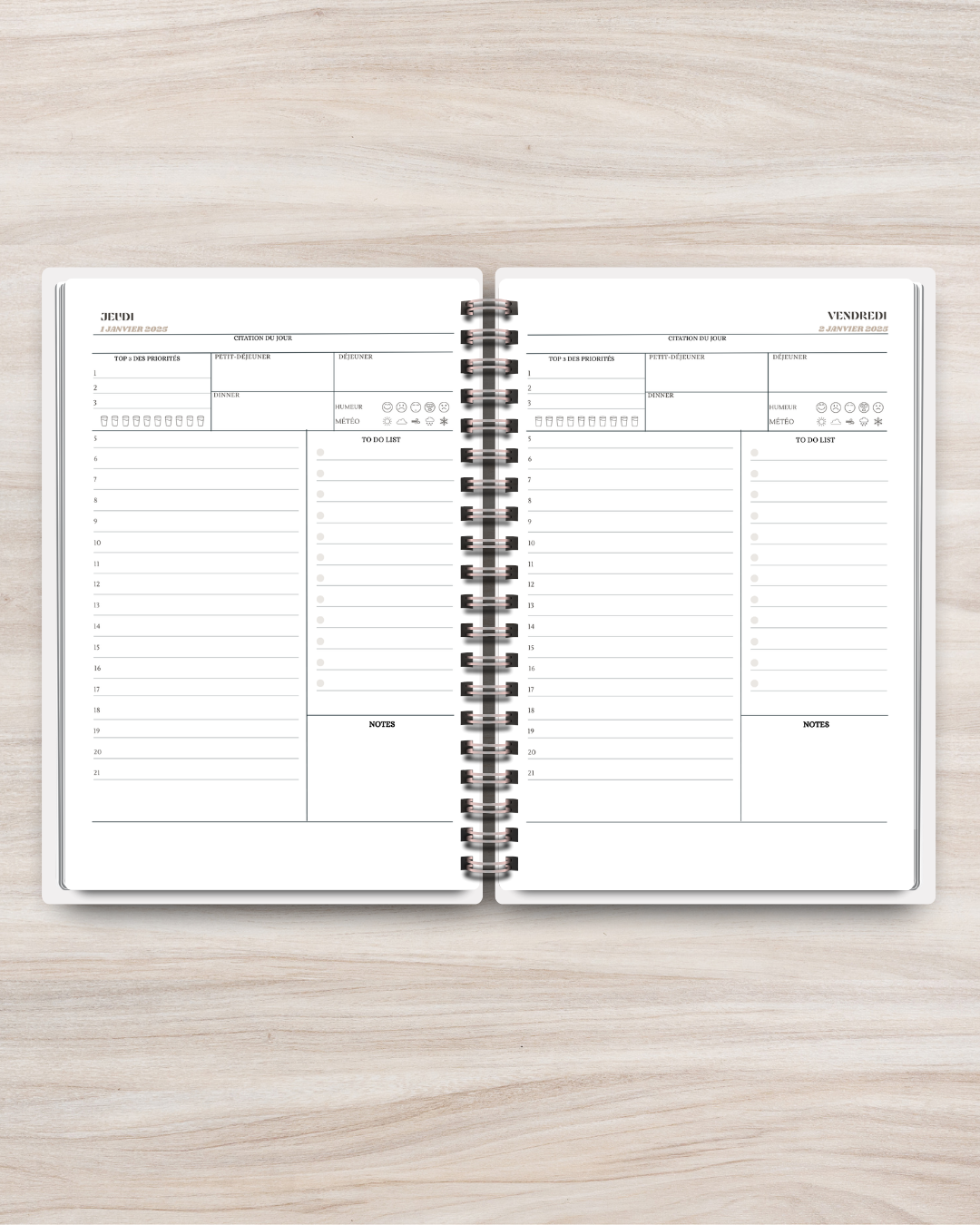 - Une pages par jour de la semaine qui comprend ( Une zone est prévue chaque jour pour écrire ta propre citation ou pensée du jour, top 3 des priorités, nombres d'eau bu par jours, repas ( petit-déjeuner, déjeuner et diner), suivi humer et météo), et tu pourras planifier ta journée de 5h à 21h , aussi to-do list et notes.